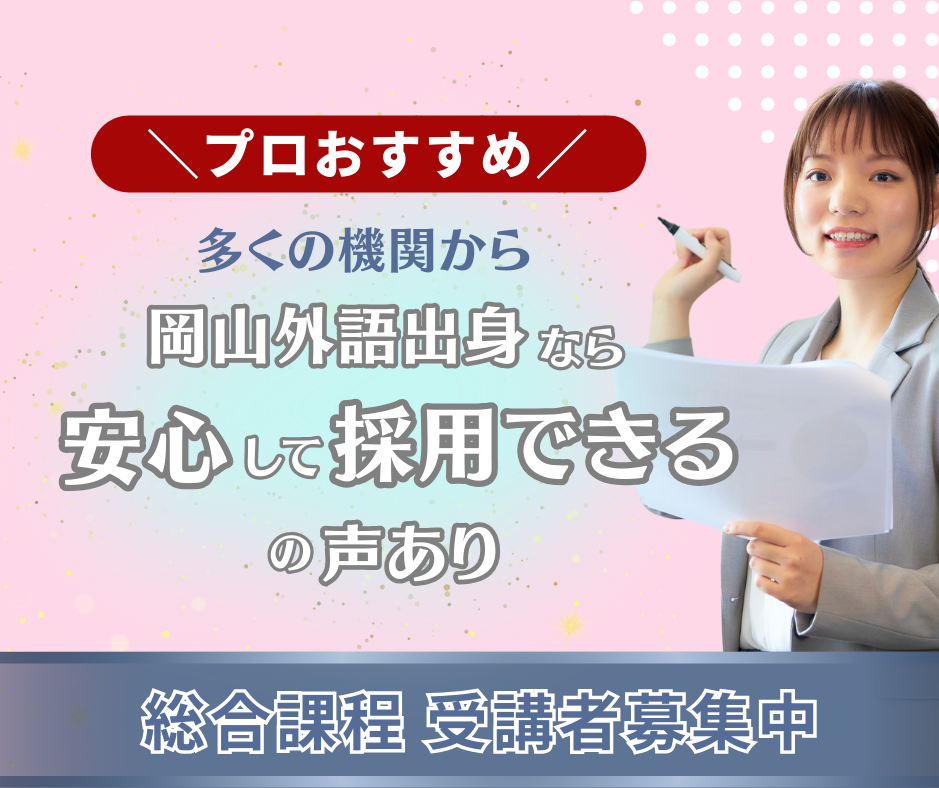 | 多くの教育機関から岡山外語学院出身なら「安心して採用できる」との声をいただいています。 |